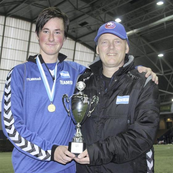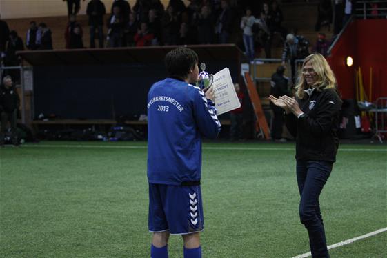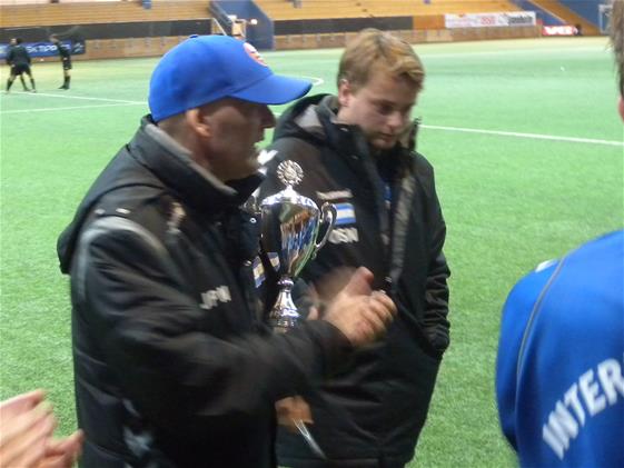 Marcus mottar pokal og gavekort på kr. 5000,- i utstyr fra Torshov på lagets vegne.