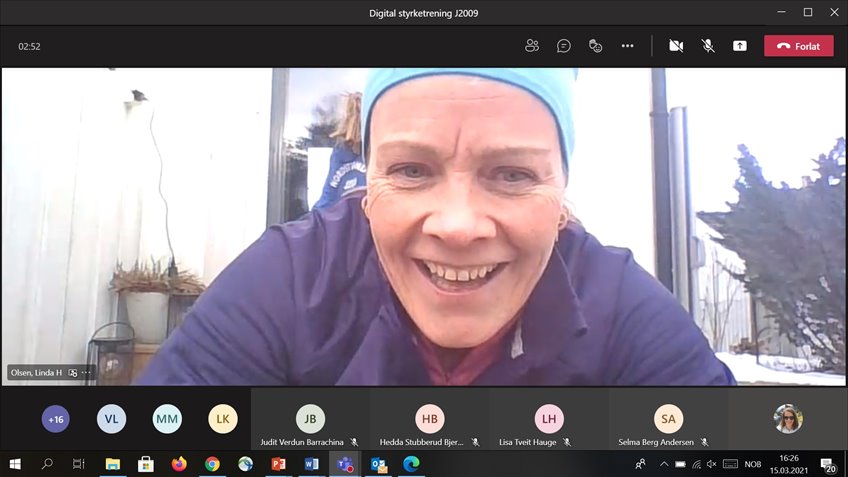 Med Linda Olsen fra lagets suverene trener-team i spissen logger jentene seg på Teams og er med på 45 minutters styrketrening hjemmefra. Innimellom skrur en av jentene på kameraet og sender et digitalt smil og vink til lagvenninnene. Mest konsentrasjon og energi går med til å følge instruksjonene fra trener Linda og datteren Vilde, som organiserer treningen sammen fra en hage på Munkerud.